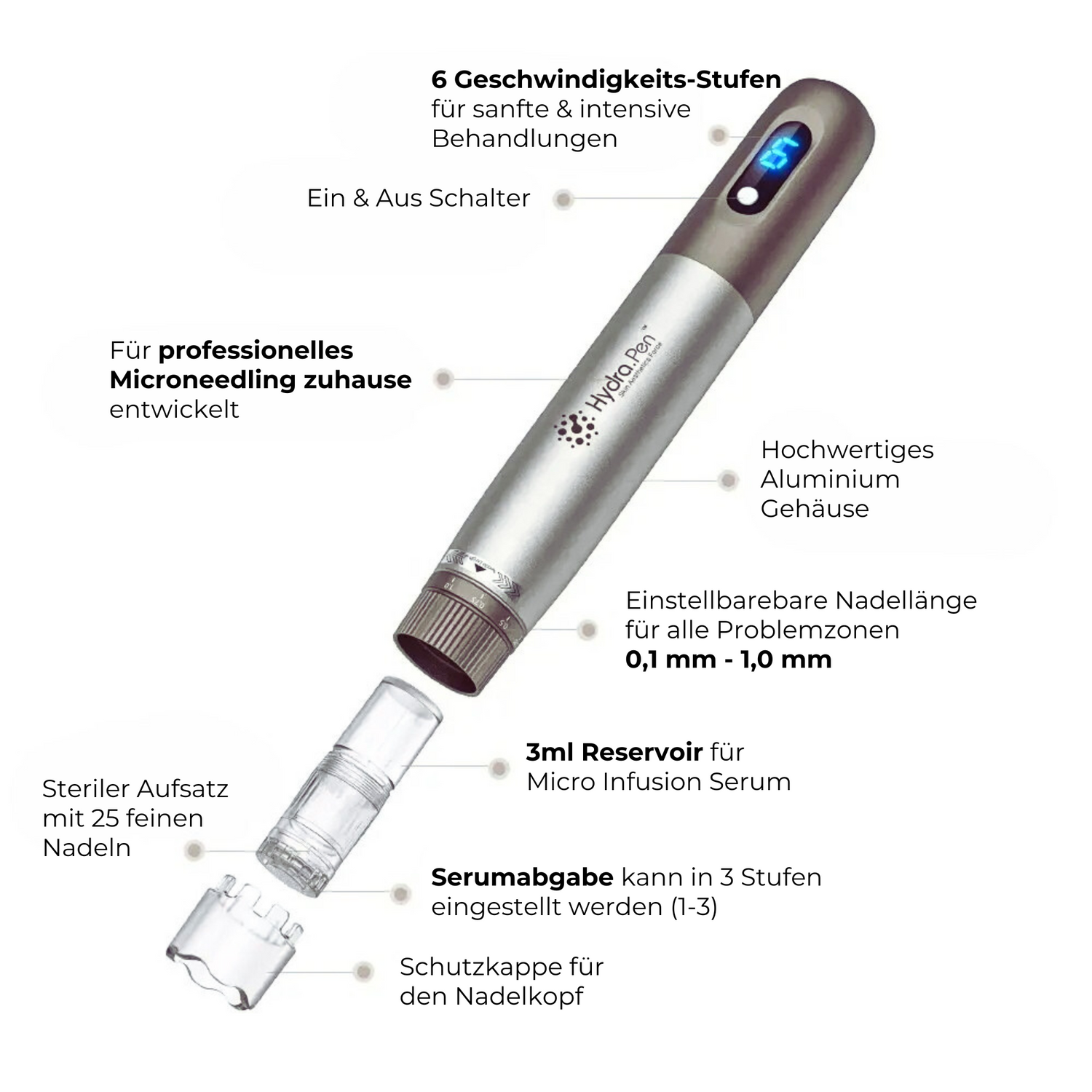 Ein Dermapen, manchmal auch Needling Pen, Microneedling Pen oder Mesopen genannt, ist ein elektrisches Mikronadelgerät, das ultrafeine Nadeln verwendet, um winzige Mikrokanäle in der Haut zu erzeugen. Diese Mikroverletzungen stimulieren natürlichen Heilungsprozesse deiner Haut, wodurch die hauteigene Kollagen- und Elastinproduktion angeregt wird.